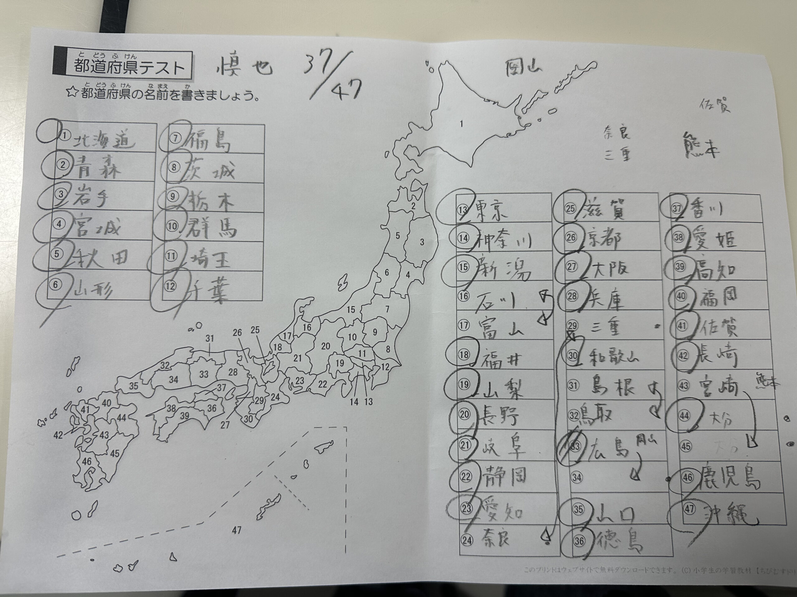 長男の都道府県を覚える勉強で、「せっかくだからパパとママと一緒にテストしよう!」と都道府県テストをやってみました。